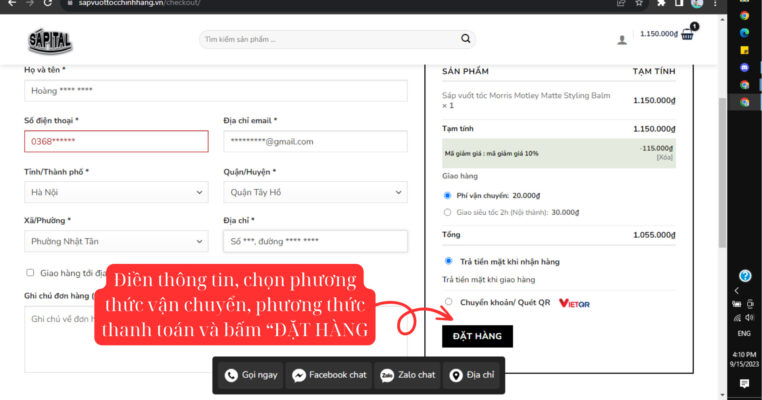 Bước 4 : Điền đầy đủ và chính xác thông tin của bạn, phương thức giao hàng, phương thức tthanh toán và bấm Đặt Hàng