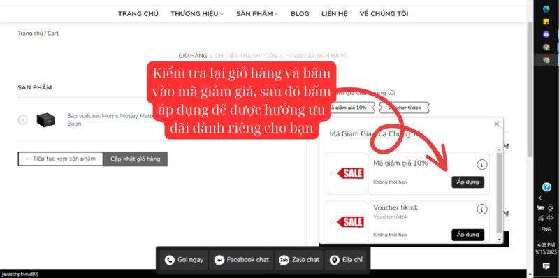Bước 3 : Kiểm tra lại những sản phẩm đã chọn trong giỏ hàng và áp dụng mã khuyến mãi để được giá ữu đãi